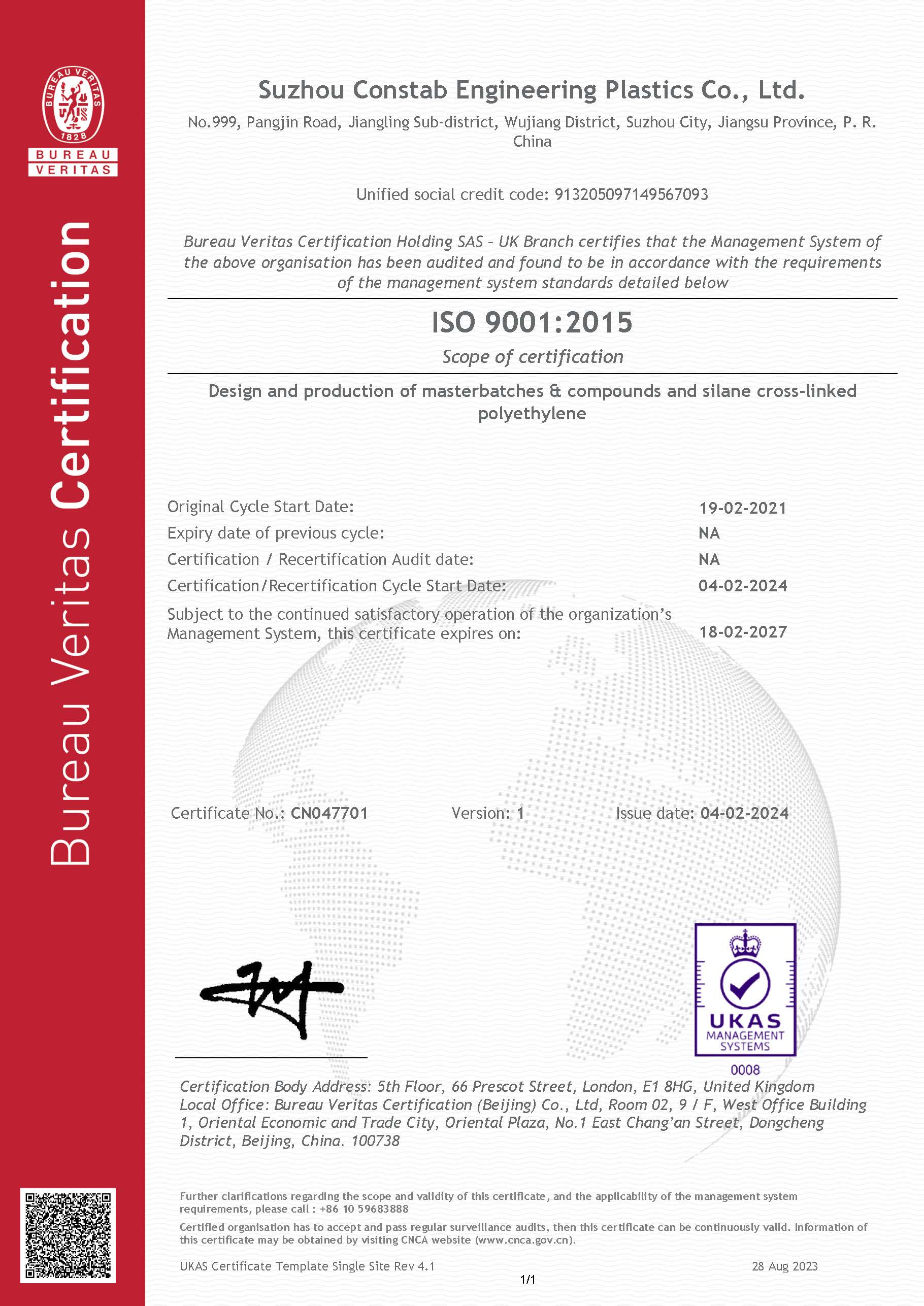 In line with the Kafrit Group, Suzhou Constab Engineering Plastics Co., Ltd. emphasizes that quality is the life of the enterprise and has certificate of quality system ISO9001:2015, the occupational health & safety system ISO45001:2018 and environmental management system ISO14001:2015 which are tailored for the production of compounds and masterbatches. With foreign advanced testing instruments and equipment, the senior quality management team ensures stability and accuracy of product quality from both hardware and software.